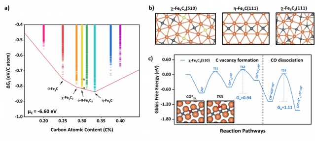 In situ-formed iron carbides (FeCx) are the key components responsible for Fischer–Tropsch synthesis (FTS, CO + H2→ long-chain hydrocarbons) on Fe-based catalysts in industry. The true active site is, however, highly controversial despite more than a century of study, which is largely due to the combined complexity in both FeCx structures and mechanism of CO hydrogenation. Herein powered by machine learning simulation, millions of structure candidates for FeCx bulk and surfaces are explored under FTS conditions, which leads to resolving the active site for CO activation. This is achieved without a priori input from experiment by first constructing the thermodynamics convex hull of bulk phases, followed by identifying the low surface energy surfaces and evaluating the adsorption ability of CO and H, and finally determining the lowest energy reaction pathway of CO activation. Rich information on FeCx structures and CO hydrogenation pathways is gleaned: (i) Fe5C2, Fe7C3, and Fe2C are the three stable bulk phases under FTS in producing olefins, where Fe7C3 and Fe2C have multiple energetically nearly degenerate bulk crystal phases; (ii) only three low surface energy surfaces of these bulk phases, namely, χ-Fe5C2(510), χ-Fe5C2(111), and η-Fe2C(111), expose the Fe sites that can adsorb H atoms exothermically, where the surface Fe:C ratio is 2, 1.75, and 2, respectively; (iii) CO activation via direct dissociation can occur at the surface C vacancies (e.g., with a barrier of 1.1 eV) that are created dynamically via hydrogenation. These atomic-level understandings facilitate the building of the structure–activity correlation and designing better FT catalysts.