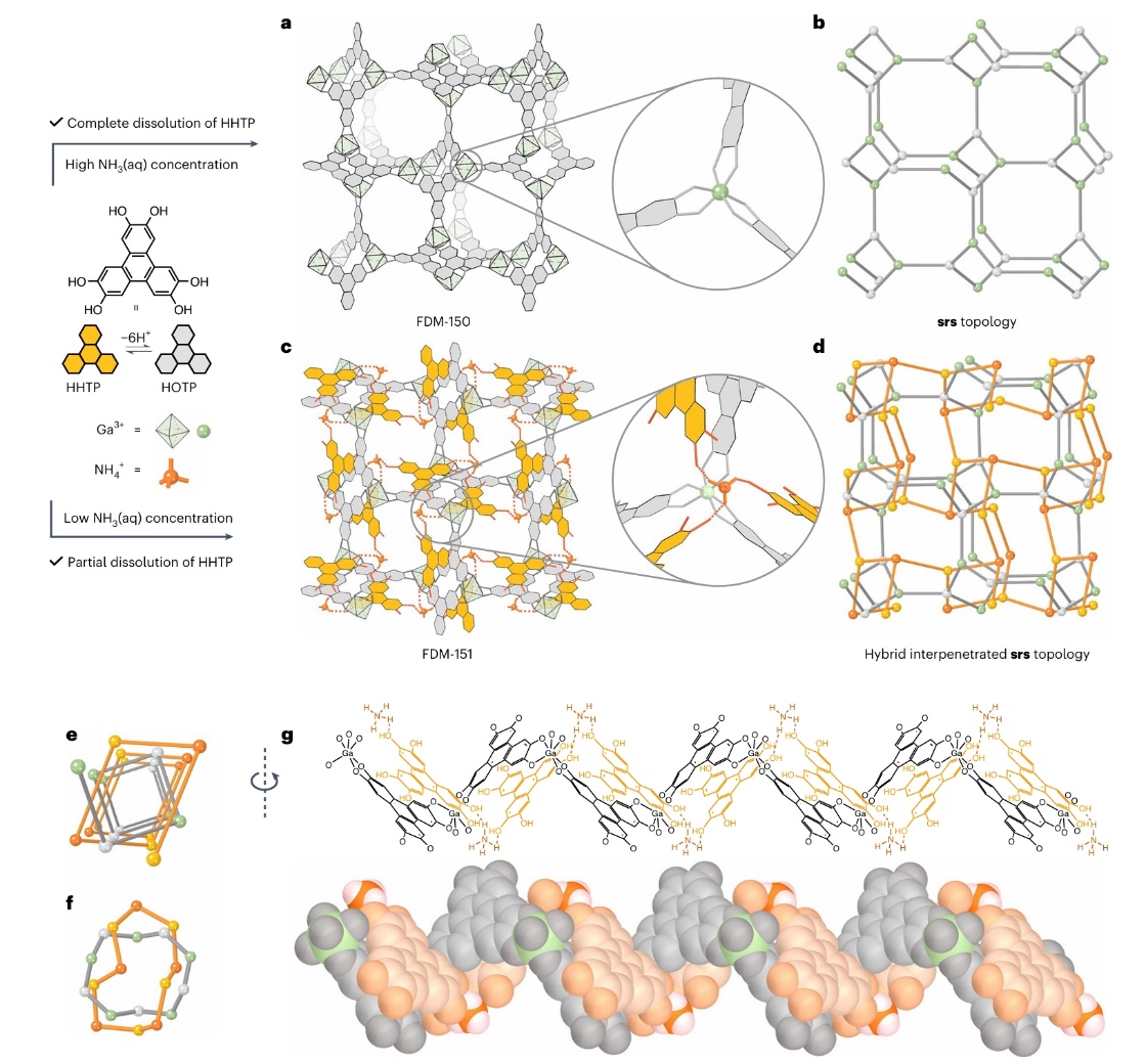 研究通过精确调控有机配体的去质子化平衡,实现了MOF与HOF的杂化纠缠共生。该材料创新性地通过NH4+与HHTP间的氢键键合形成HOF网络,并通过Ga3+与HOTP间的配位键合形成MOF网络,两套网络通过π-π堆叠作用共同增强框架稳定性。材料每个单胞内高度连通的孔道能容纳多达100个水分子,进一步结合HOF网络提供的原生质子载体,FDM-151在95 ℃和100%湿度下能实现1.1×10−2 S cm−1的质子电导率。这种杂化网络纠缠策略突破了单一框架的性能局限,为开发新型功能材料提供了新思路。
